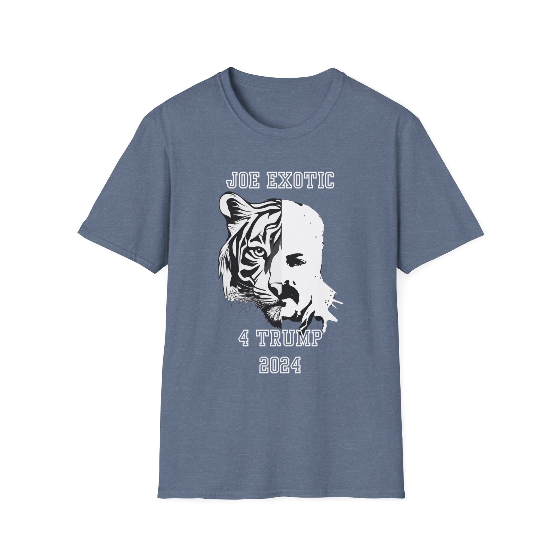 The captivating artwork, split between Exotic's iconic look and the tiger's fierce gaze, makes a unique political statement with the text "Joe Exotic 4 Trump 2024." Perfect for fans of the wild and the extraordinary, this tee combines personality with a touch of rebellion.